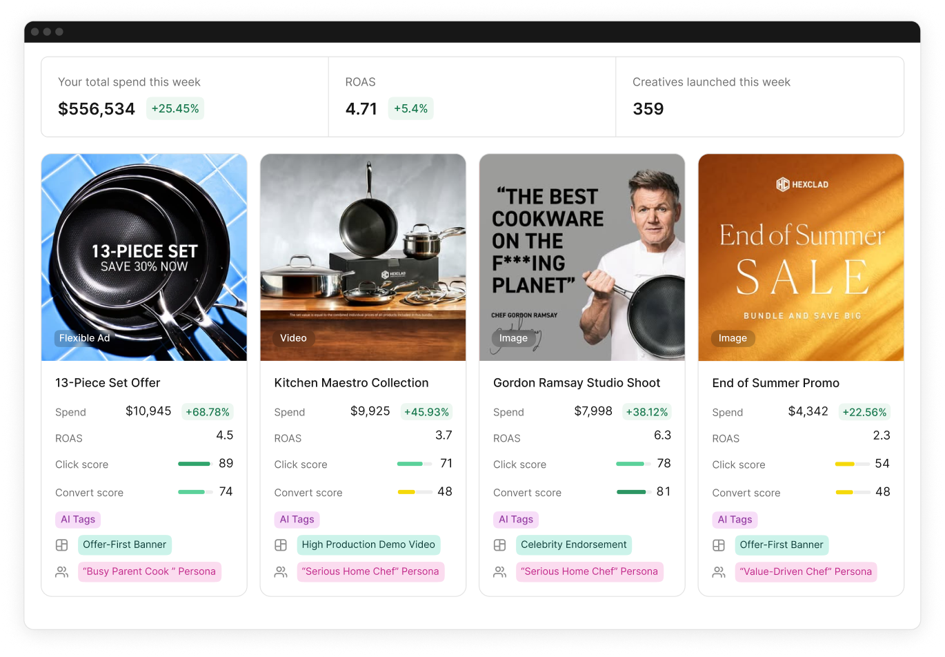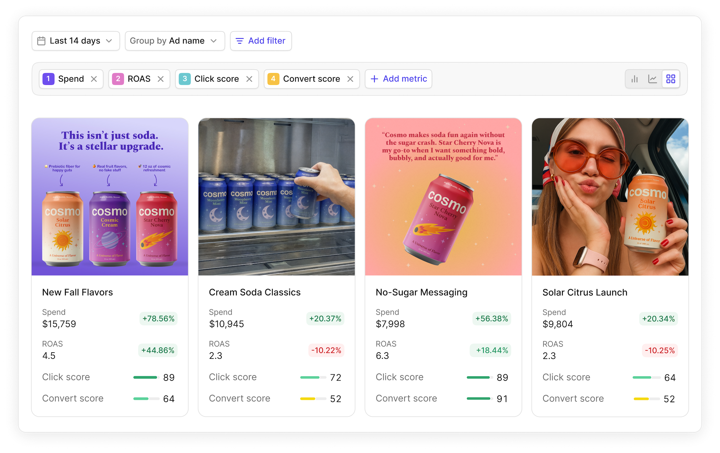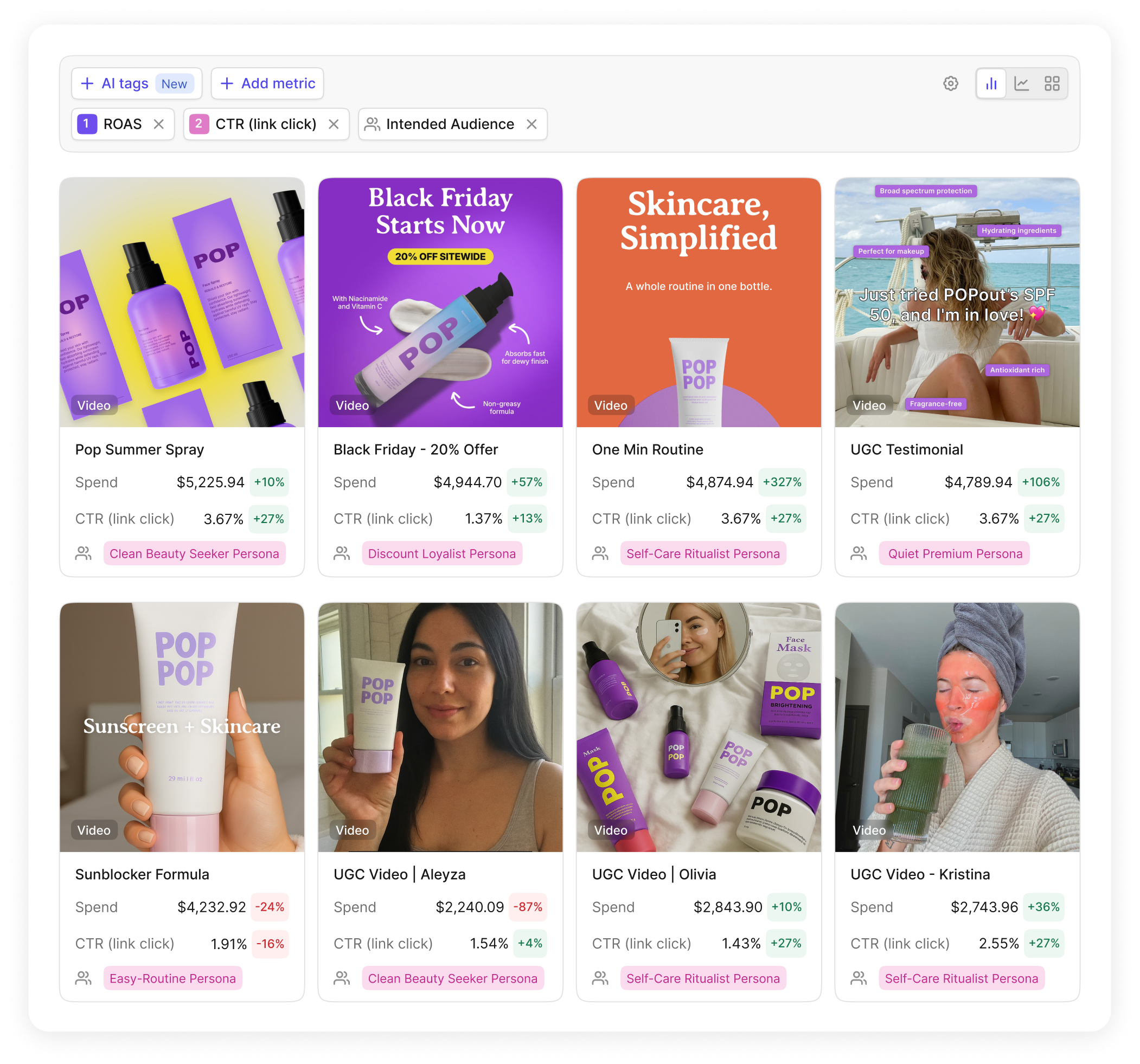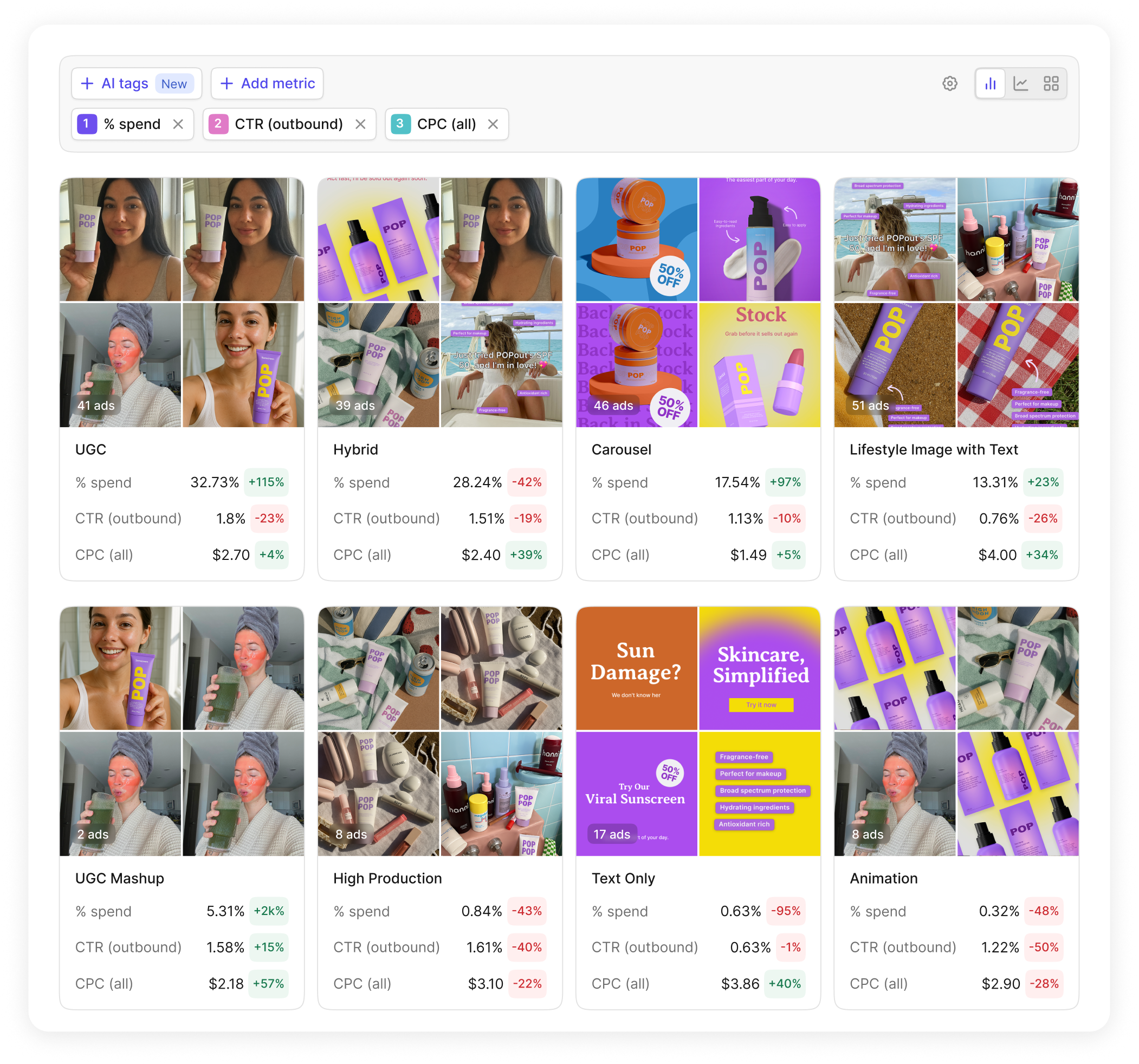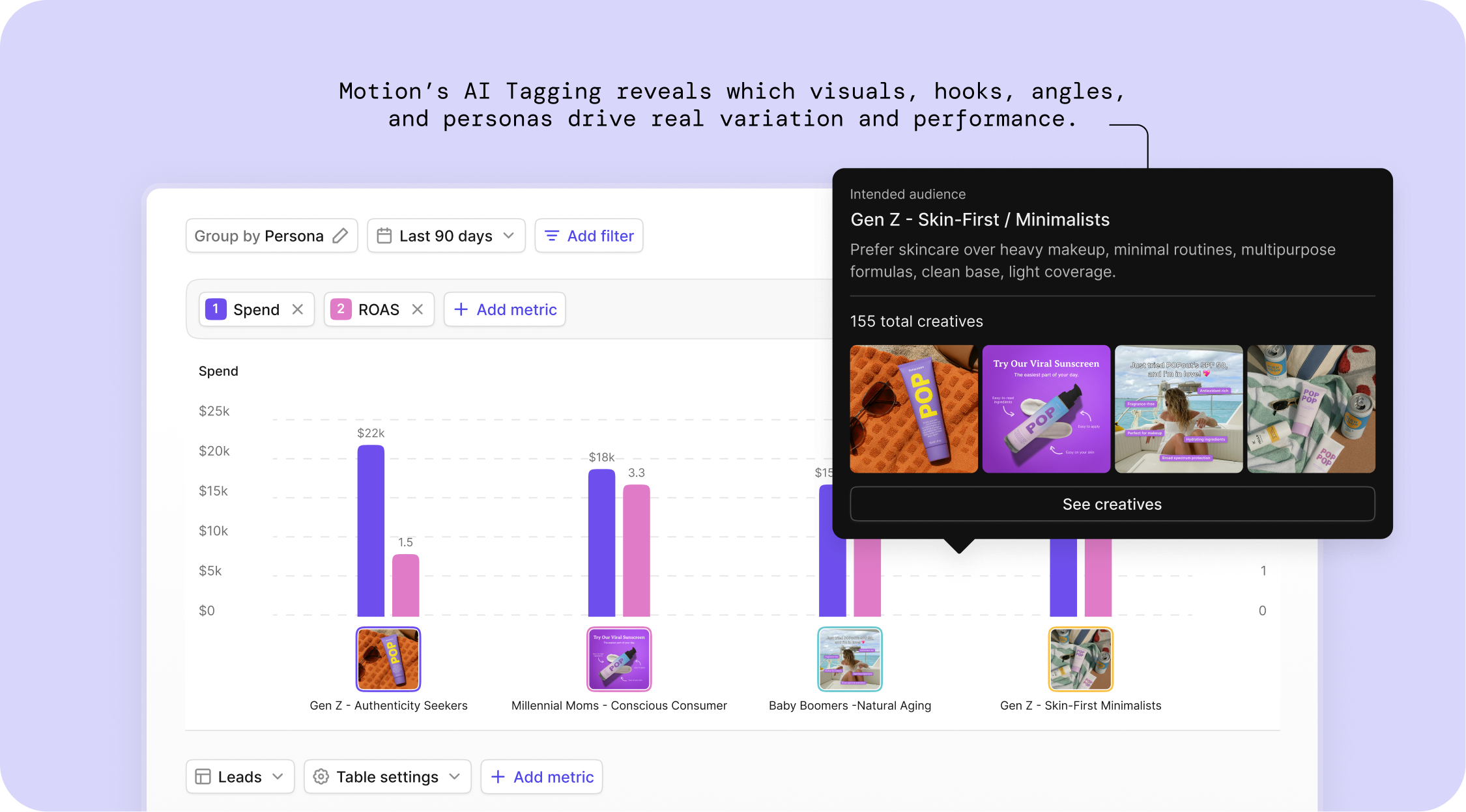 Motion automatically groups your creatives together, giving you a holistic view of performance. This reveals winning creative patterns vs. looking at individual ad performance.