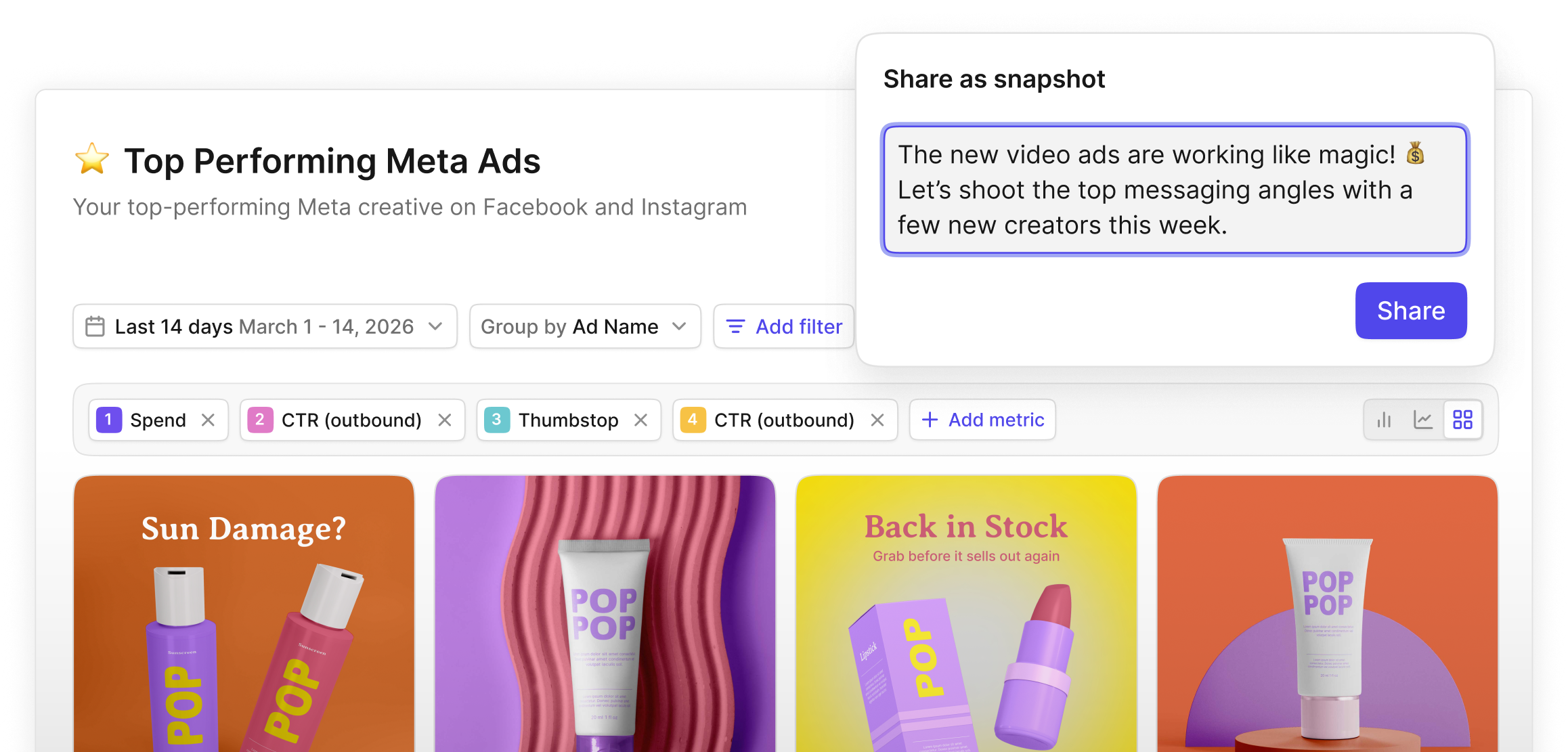 Motion’s reports include creative assets alongside your metrics, so your team can visually see what’s working or not working.