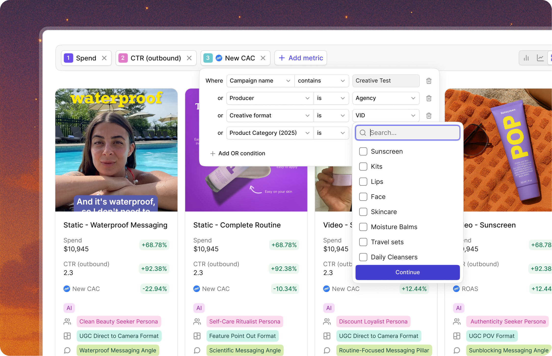 Our AI reviews your ad account and picks up brand-relevant categories that evolve with your creative strategy over time.