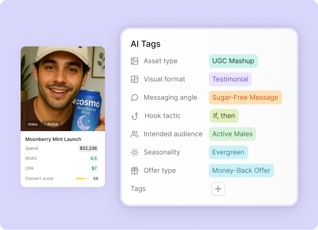 These tags appear directly in your reports, dashboards, and alongside each creative — no manual labelling required.